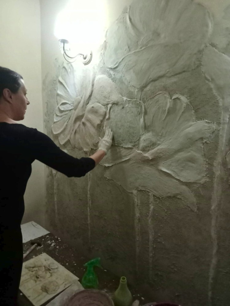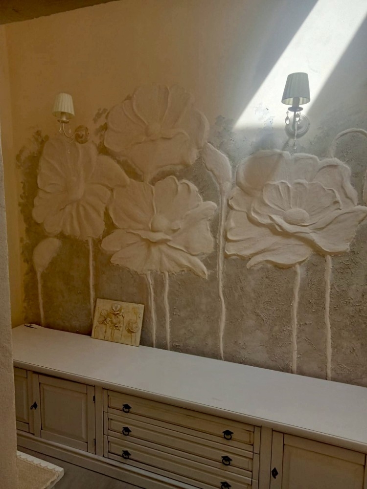 Fiori su muro con stucco a rilievo