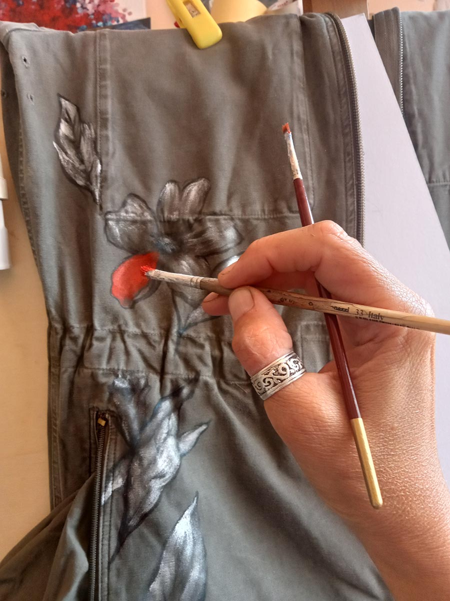 La pittura su tessuto è cominciata per una commissione di una ditta che mi ha fatto realizzare il proprio logo su magliette bianche, dopodiché ho ricevuto una richiesta per trasformare un abito "anonimo" che aveva in qualcosa di particolare per la festa di laurea della figlia.